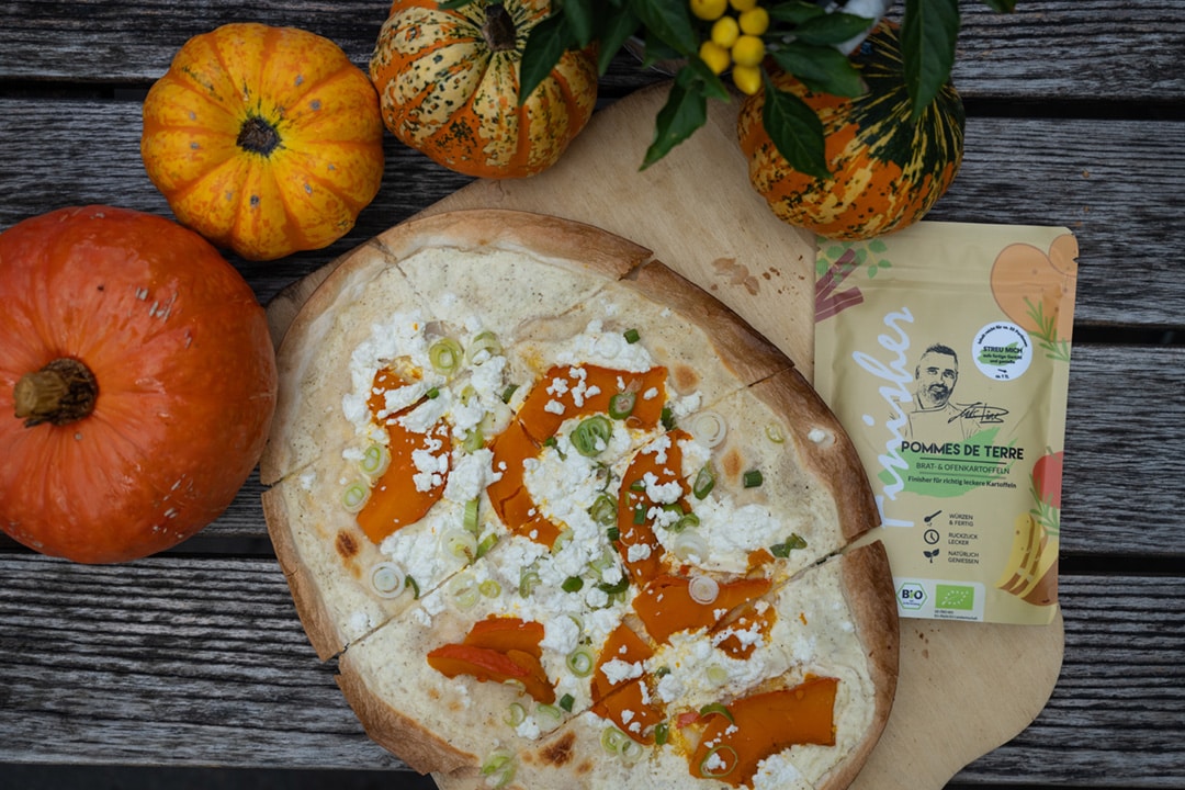 Für den Teig deines Flammkuchens brauchst du nur Mehl, Wasser, Salz und Olivenöl. Den Teig ausrollen, mit einer Mischung aus Crème fraîche und körnigem Frischkäse oder Ricotta bestreichen, Kürbisscheiben darauflegen und den Flammkuchen im Ofen goldbraun backen. Nach dem Backen streust du den Bio Pommes de Terre Food Finisher über den warmen Flammkuchen – fertig ist dein herbstlicher Gaumenschmaus!