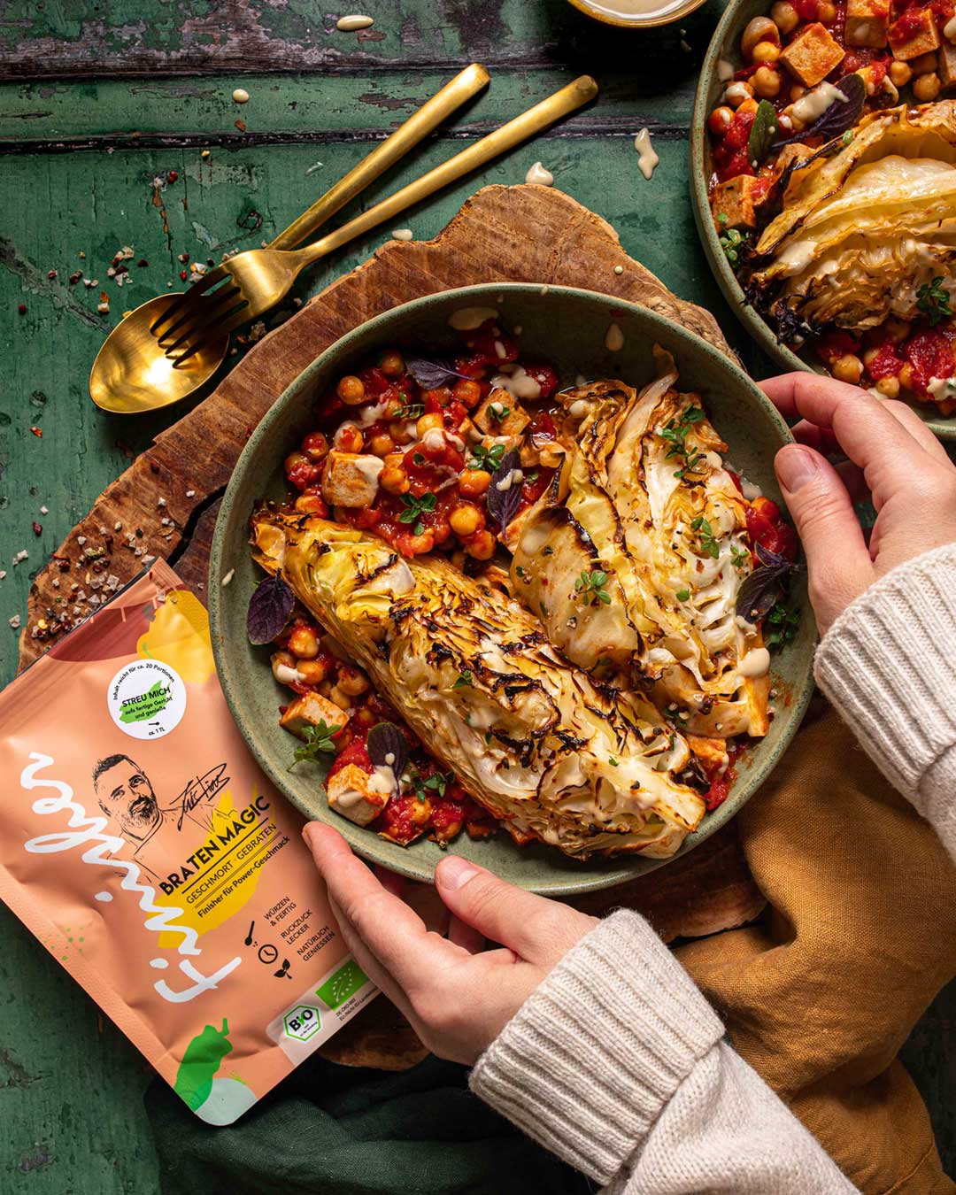 Das Highlight dieses Rezeptes ist der BIO BRATEN-MAGIC FOOD FINISHER von Luis Dias. Mit seiner Mischung aus Sonnenflocken, schwarzem Pfeffer und Chipotle Chilis gibt dieser Finisher dem Gericht eine würzig-rauchige Note und macht es zu einem unvergesslichen Geschmackserlebnis. Einfach in der Anwendung und perfekt abgestimmt, ermutigt dieser Finisher auch Kochanfänger dazu, neue Wege in der veganen oder modernen Küche zu gehen.
